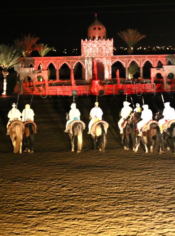 Experience an unforgettable night of fun and excitement! Enjoy the sights and sounds of Moroccan musicians and dancers while having a delicious 5-course meal in traditional caidal tents. Be greeted by Berber tribes singing as you arrive. The night is filled with entertainment—music, dancing, horseback stunts, fireworks, parades, acrobats, and belly dancing.