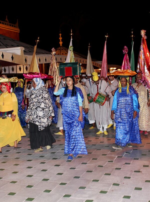 The “fantasia” show, originally from the Rif region, is a traditional war ceremony. Groups of horsemen, each representing their tribe’s best riders, charge forward, aiming their rifles at the sky and firing together, creating loud bursts and cheers.