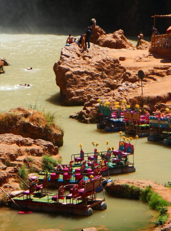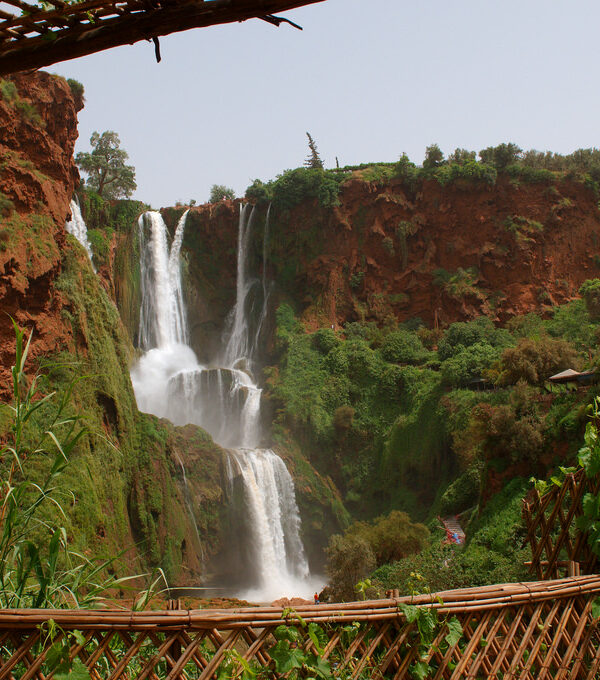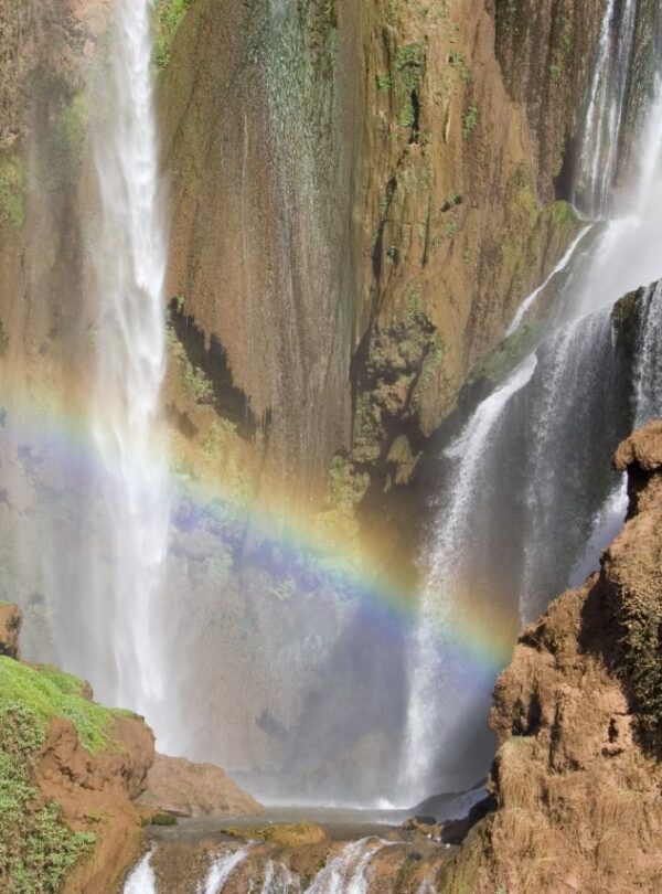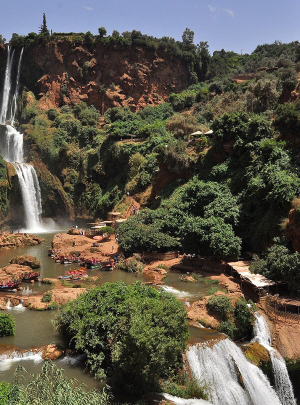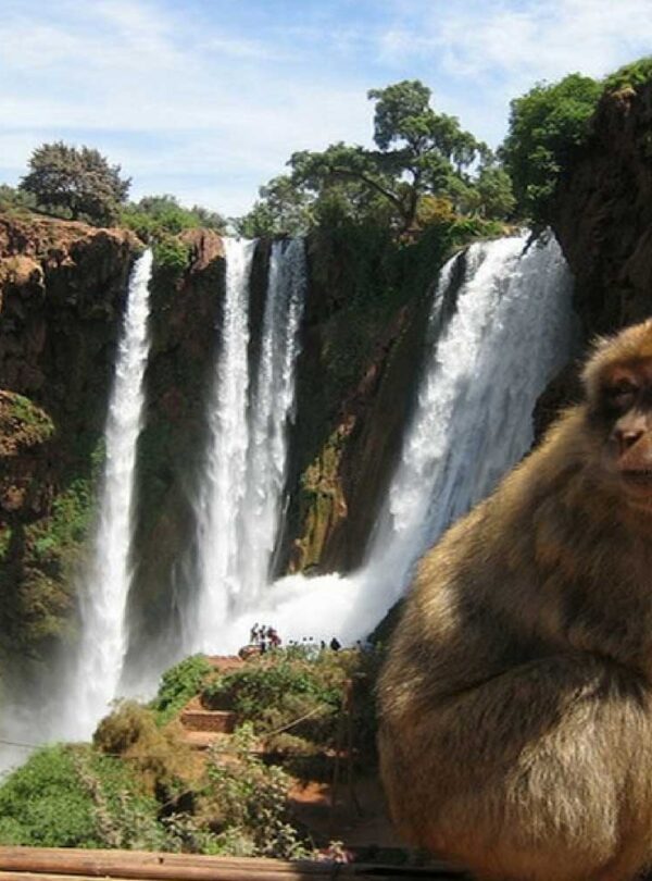 Ouzoud Waterfalls: 160 km from Marrakech is one of the most beautiful sites in the Middle Atlas, where sumptuous waterfalls, surrounded by an almost permanent rainbow, fall from a height of 110 m into a basin of limestone rocks in the middle of lush vegetation. It is possible to swim at the foot of the waterfalls, accessible by a shaded path dotted with olive trees.